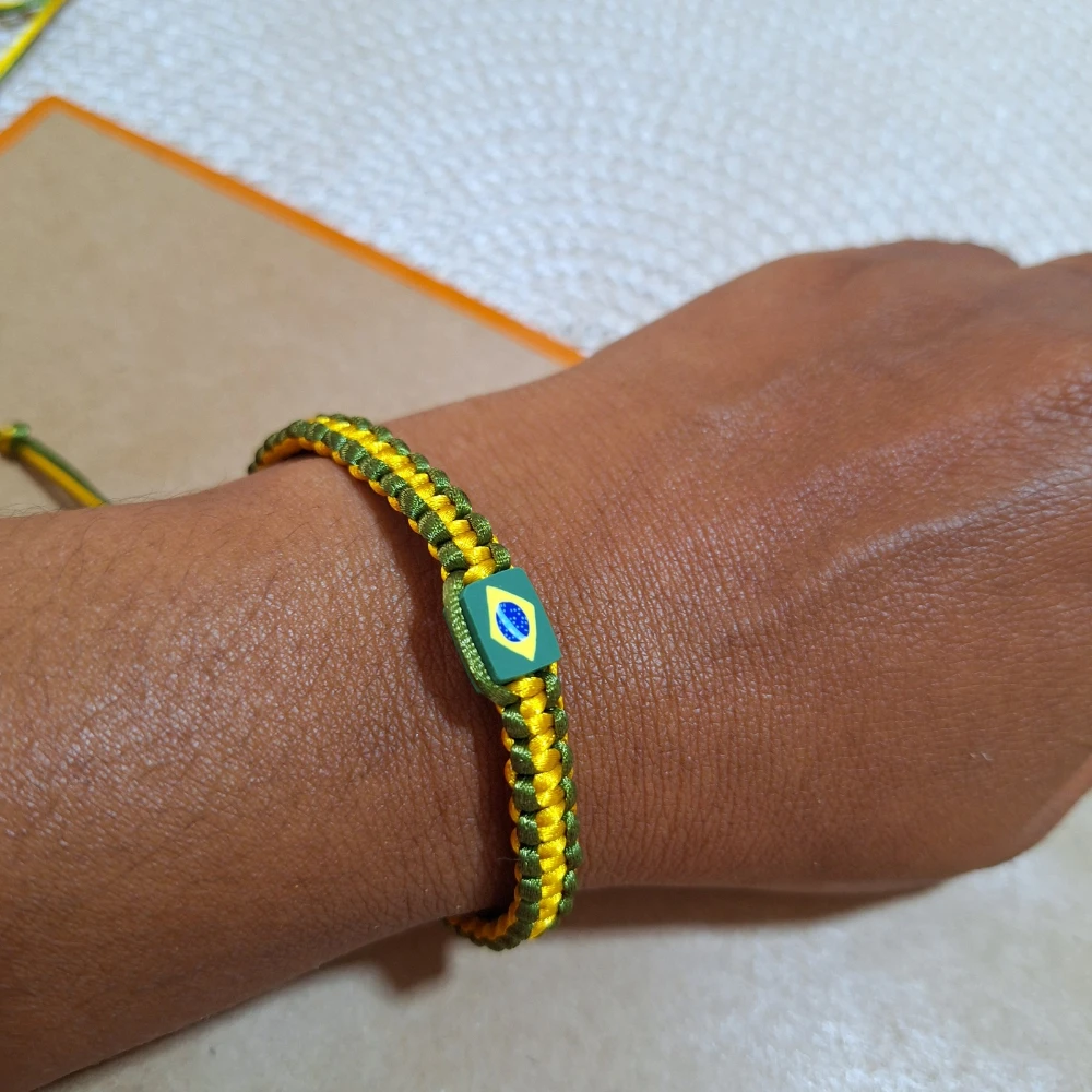 Pulseira artesanal na cor verde e amarela com pingente central da bandeira do Brasil. Confortável, ajustável e leve, ideal para usar no dia a dia ou em eventos esportivos para expressar orgulho nacional. É ajustável ao pulso tamanho entre 16 a 23 cm